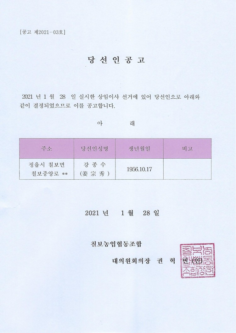 상임이사 당선인 공고 페이지 정보 작성자 칠보농협 작성일21-01-28 15:03 조회3,215회 댓글0건 관련링크 이전글 다음글 목록 본문 2021.1.28. 실시한 상임이사 선거에서붙임과 같이 당선인이 결정되었기에 공고합니다. 붙 임 : 당선인공고 1부 끝. 댓글목록 등록된 댓글이 없습니다. 이전글 다음글 목록